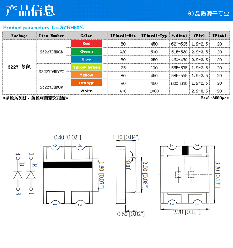 尺寸小,宽视角;多种颜色可选,亮度高,一致性好;产品经过严格的信赖性实验,可靠性高。